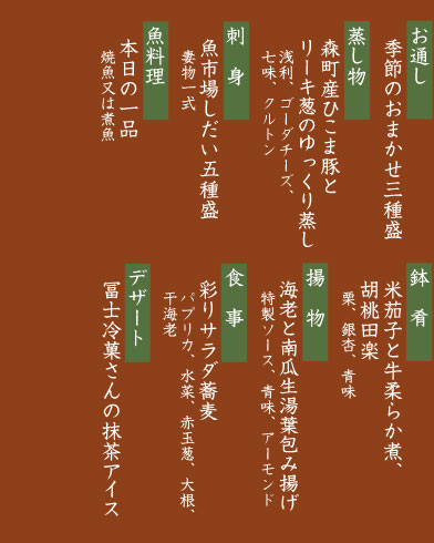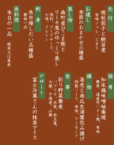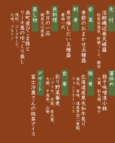 [飲み放題対象ドリンク] ・生ビール ・瓶ビール ・サワー類 ・ウイスキー ・日本酒(純米冷酒含む) ・焼酎 ・ワイン ・ソフトドリンク類 *ご予約のお客様は4名様~45名様位まで人数に合わせすべて個室にてご用意いたします。(要前日予約) *仕入れ状況に応じて内容が一部変更する場合がございます。 *表示献立は、イメージです、旬や仕入れ状況に応じて産地及び内容が一部変更となる場合がございます。