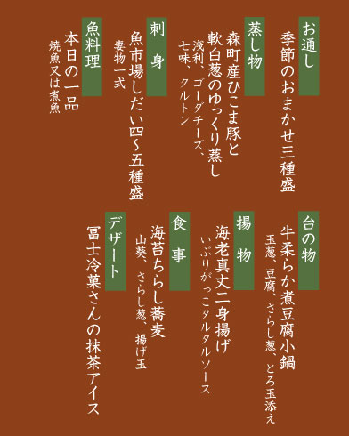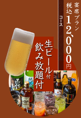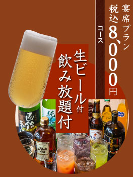 [飲み放題対象ドリンク] ・生ビール ・瓶ビール ・サワー類 ・ウイスキー ・日本酒(純米冷酒含む) ・焼酎 ・ワイン ・ソフトドリンク類 *ご予約のお客様は4名様~45名様位まで人数に合わせすべて個室にてご用意いたします。(要前日予約) *仕入れ状況に応じて内容が一部変更する場合がございます。 *表示献立は、イメージです、旬や仕入れ状況に応じて産地及び内容が一部変更となる場合がございます。
