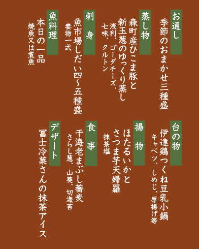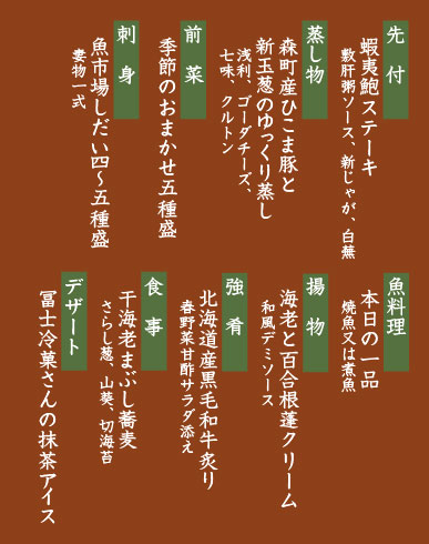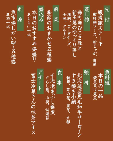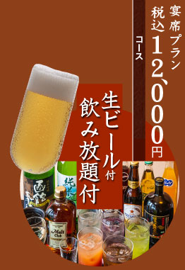 [飲み放題対象ドリンク] ・生ビール ・瓶ビール ・サワー類 ・ウイスキー ・日本酒(純米冷酒含む) ・焼酎 ・ワイン ・ソフトドリンク類 *ご予約のお客様は4名様~45名様位まで人数に合わせすべて個室にてご用意いたします。(要前日予約) *仕入れ状況に応じて内容が一部変更する場合がございます。 *表示献立は、イメージです、旬や仕入れ状況に応じて産地及び内容が一部変更となる場合がございます。