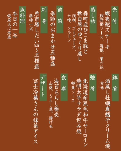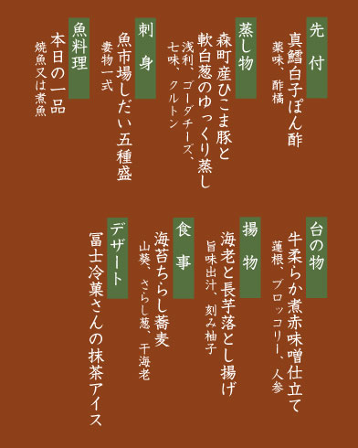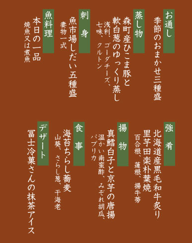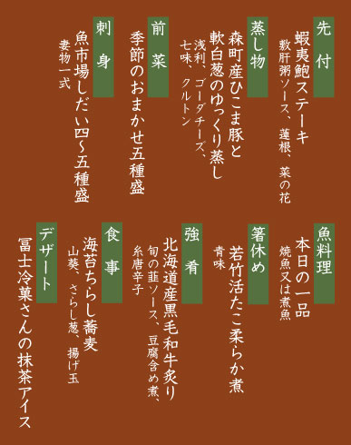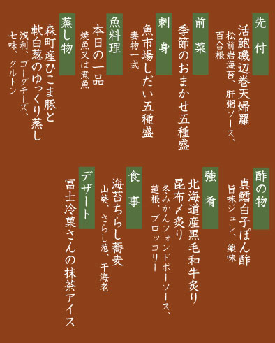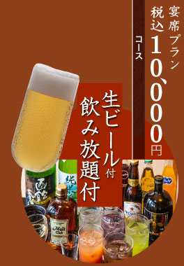 [飲み放題対象ドリンク] ・生ビール ・瓶ビール ・サワー類 ・ウイスキー ・日本酒(純米冷酒含む) ・焼酎 ・ワイン ・ソフトドリンク類 *ご予約のお客様は4名様~45名様位まで人数に合わせすべて個室にてご用意いたします。(要前日予約) *仕入れ状況に応じて内容が一部変更する場合がございます。 *表示献立は、イメージです、旬や仕入れ状況に応じて産地及び内容が一部変更となる場合がございます。